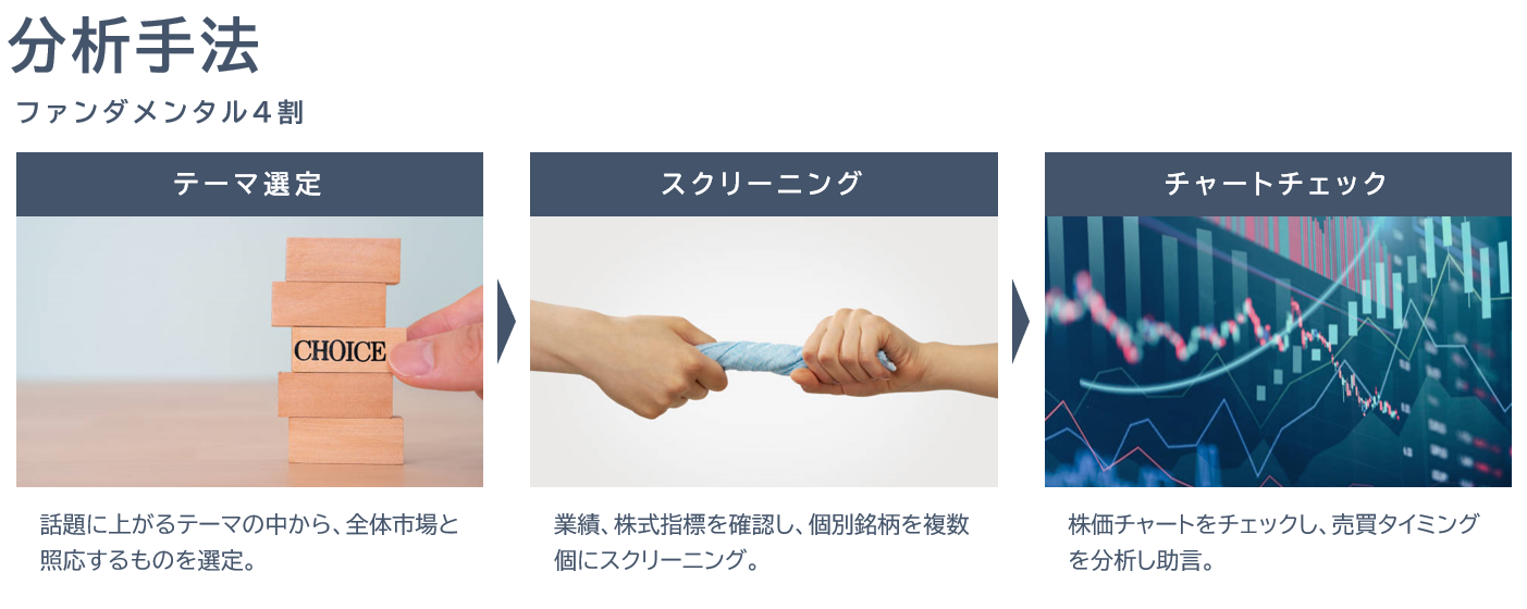 各株価を毎日チェックし、銘柄ごとの売買サインや状況判断に関する情報をご提供します。毎週金曜11時10分から「特撰☆市況&銘柄解説会」を開催します。そして売買チャンスと思われる日の15時20分頃(当日新規の場合)、または17時頃(翌日新規で指値の場合)に「特撰☆助言メール」をお送りします。